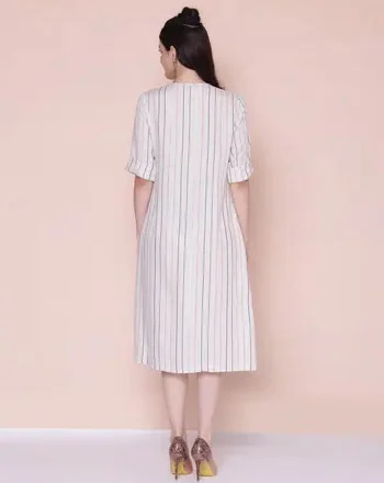This outfit features a stylish striped tunic that falls just below the knees. This kurta is made out of viscose flax, a material that feels and looks like silk. The multicolored stripes that decorate the beige base bring the perfect combination of formal and casual outfits. It is an A-line dress with no slits and can hence be worn as a dress as well. You can look dashing in a video call meeting at work and be comfortable at home during your breaks. You can wear a high bun or a half-bun to add elegance to your attire. Top off your outfit with colorful accessories to match the multicolored stripes on this dress!